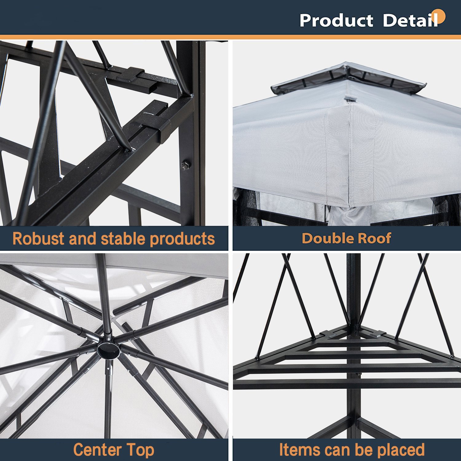Considerate Netting Design: Come with a covenient netting, the gazebo can sure provide you with a secure and comfortable shelter. Just close the privacy walls with zippers, you can totally be protected from the disturbing small animals. Hook design and straps for convenient use.