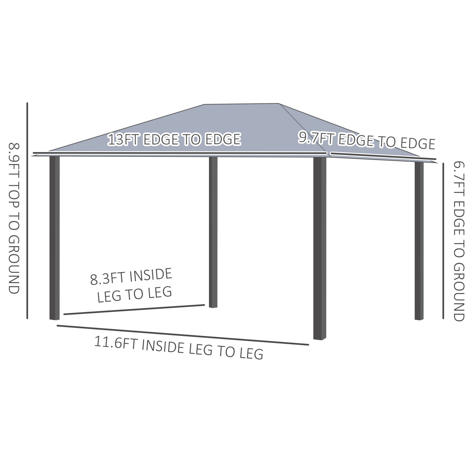 OUTDOOR CANOPY GAZEBO DIMENSION: Overall Dimension: 13'L x 9.7'W x 8.9'H, Eave Height: 6.7', Space between Column: 11.6'L x 8.3'W.