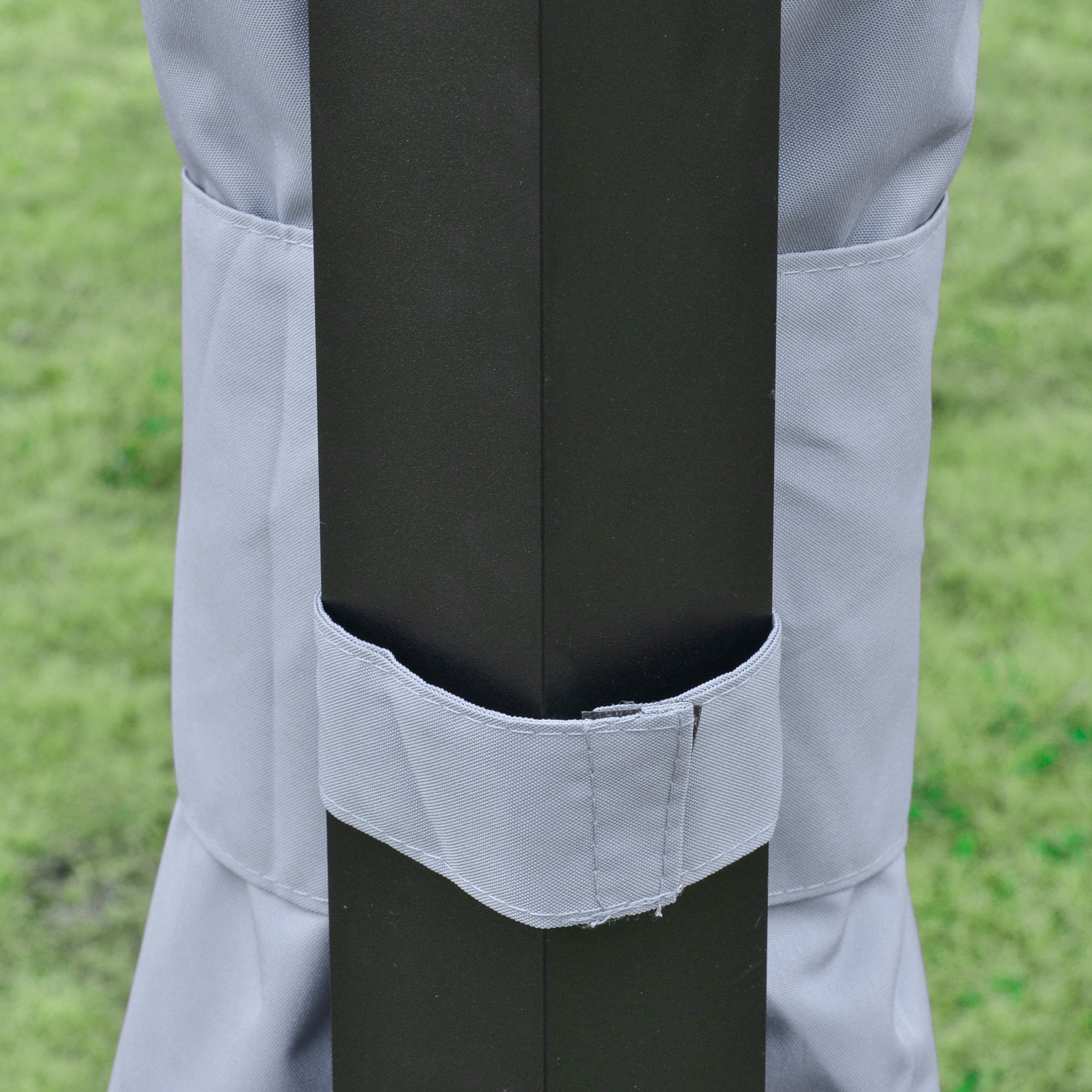 STABLE STANDING: This outdoor gazebo's frame is made with steel and aluminum for reliability, while the triangular structures on the frame create extra stability. Furthermore, ground stakes are pounded into the feet, providing even more reinforcement.