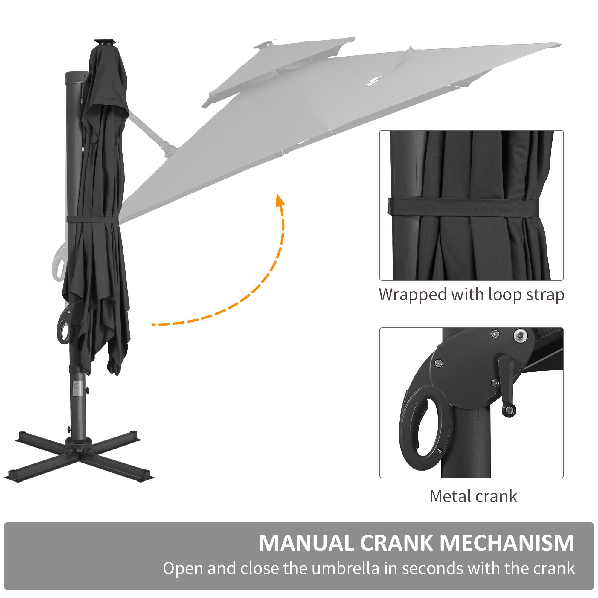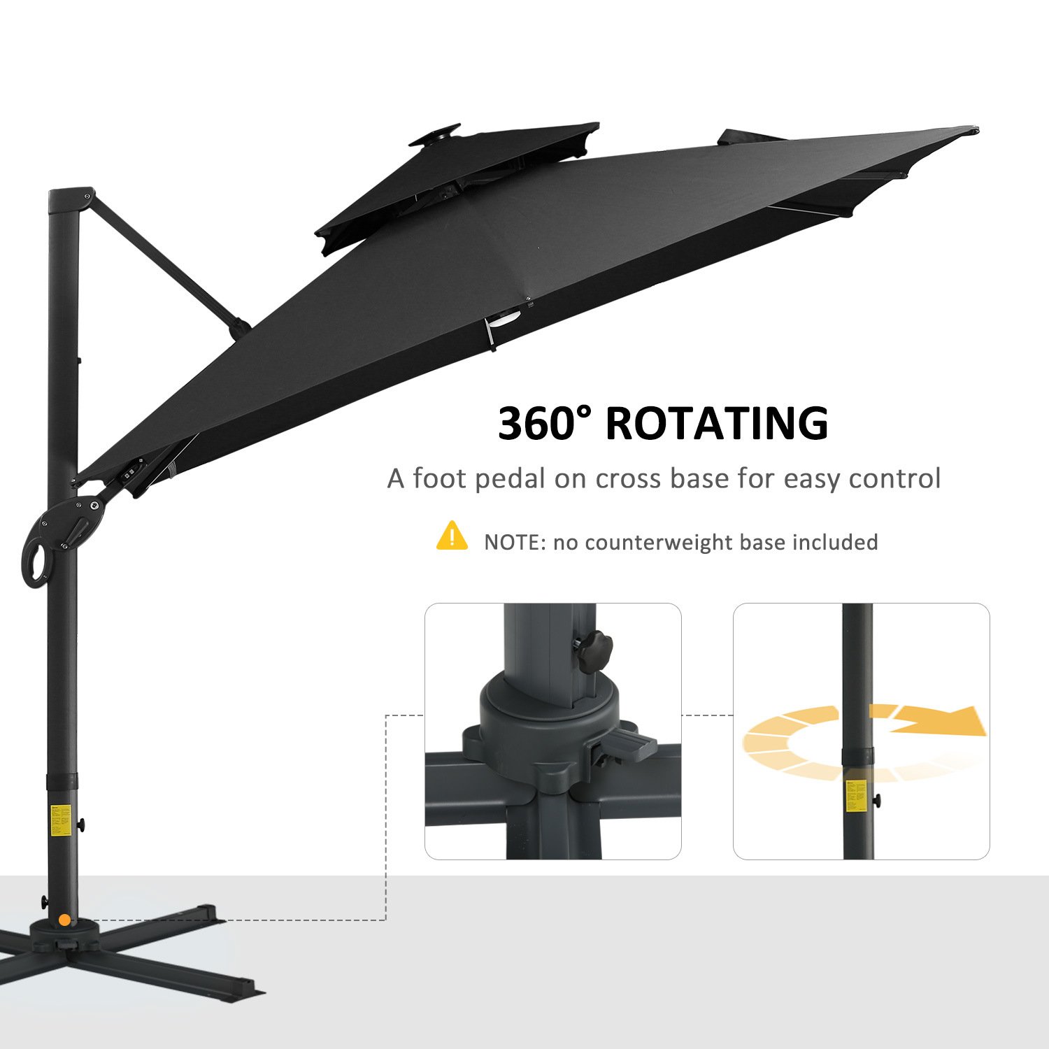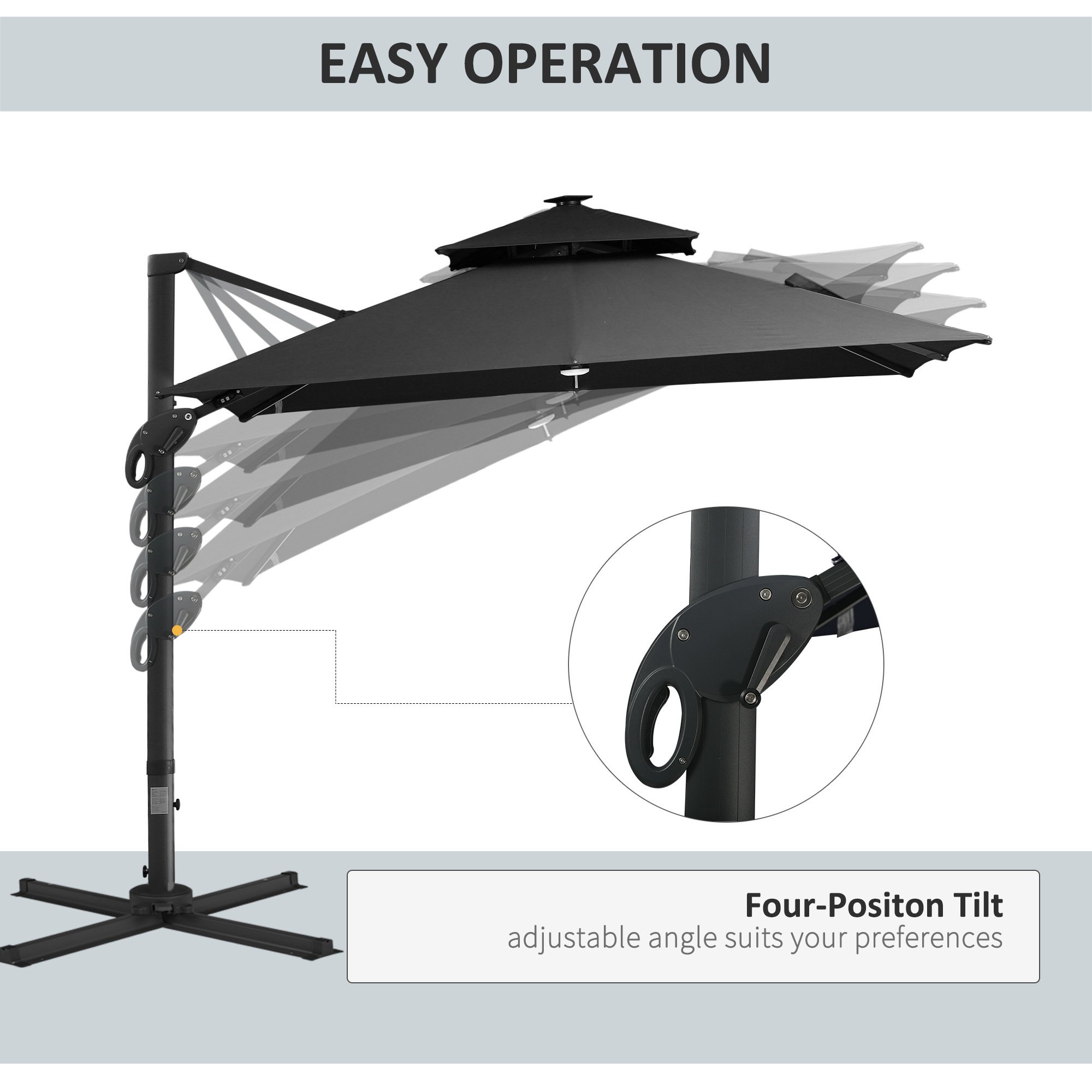 Four Angle Adjustable Tilt: Use the included hand crank to easily open and shut your patio solar umbrella. Choose where your umbrella protects, lights and shades when you adjust the angle to suit your preference. Rotate the cantilever stand 360 degrees for full control using the foot pedal below.