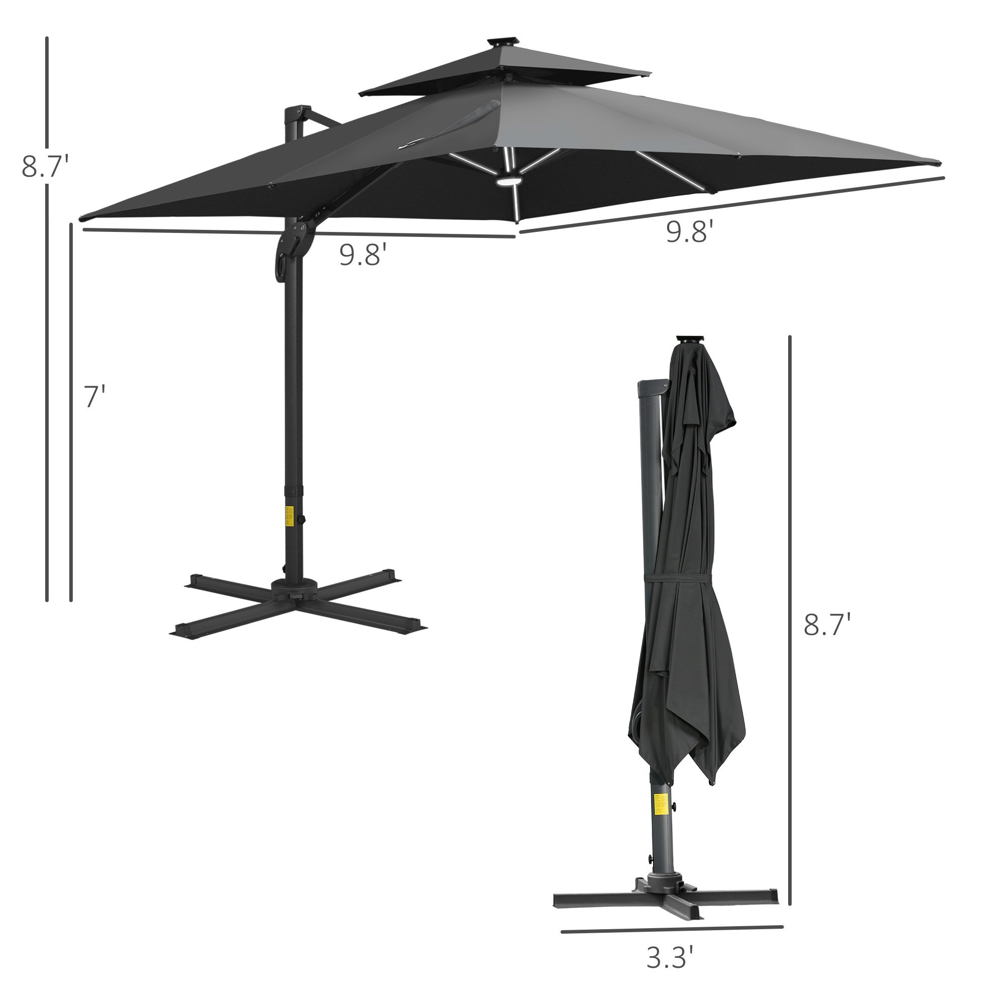 Cantilever Patio Umbrella Info: Umbrella Canopy Dimension: 9.7'L x 9.7'W. Umbrella Height: 9.5' H. Cross Base Dimensions: 39.25" L x 39.25" W x 2.25" H. Note: Required 286 lbs. base weight not included. Note: Do not use umbrella during extreme weather (strong wind, heavy rain, snow).