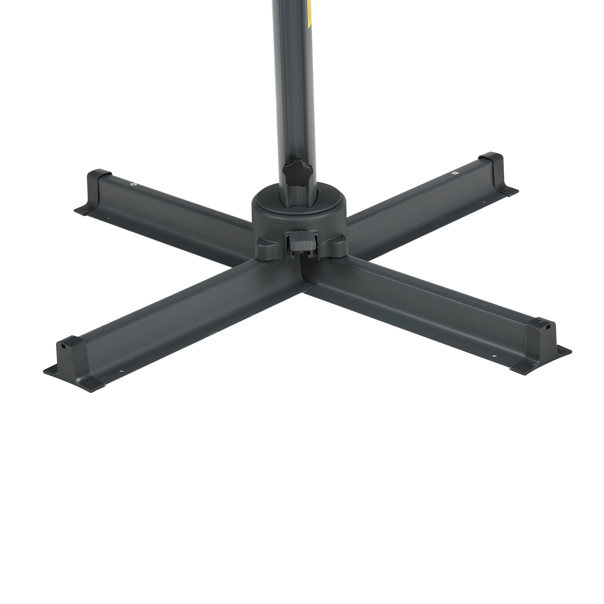 Offset Cantilever Umbrella: This lighted umbrella can keep friends and furniture cool and protected from the sun. It includes a cross base that can mount to the ground keeping it stationary on your deck or other surface. The cross base does not include a base counterweight. You can weight the cross base with a heavy object that weighs 286 lbs. or purchase our fitting models (Outsunny SKU 84D-048 or 84D-123).
