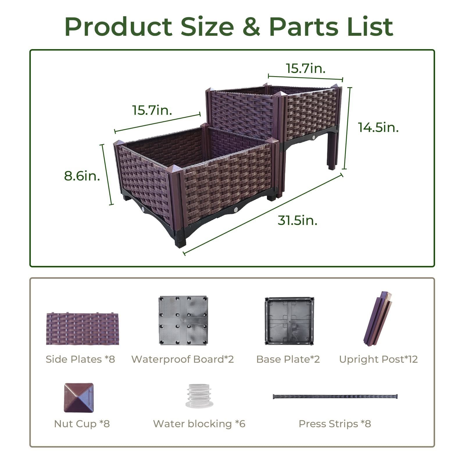 1.Easy to Install & Space-Saving- The self-watering elevated garden planter comes in a complete set and is simple to put together. Simply mount baseplate, sidewall, and other parts in turn. No tool is needed in your assembly. The realistic rattan appearance can serve as a stylish decoration. And its compact outfit is convenient to move around for your little space, bringing nature into your home.