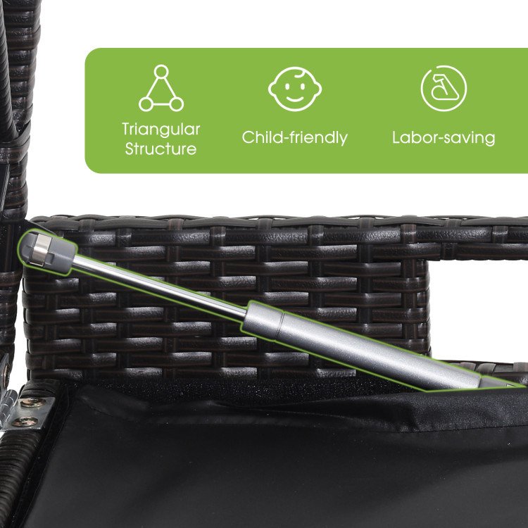 1.3-in-1 Multifunctional Design: This patio storage box can be also used as a patio bench or as a coffee table. And designed with strengthened metal structure, the bench features 795 lbs max load. Moreover, the hand-woven mix brown PE rattan looks elegant and withstands long-time use.