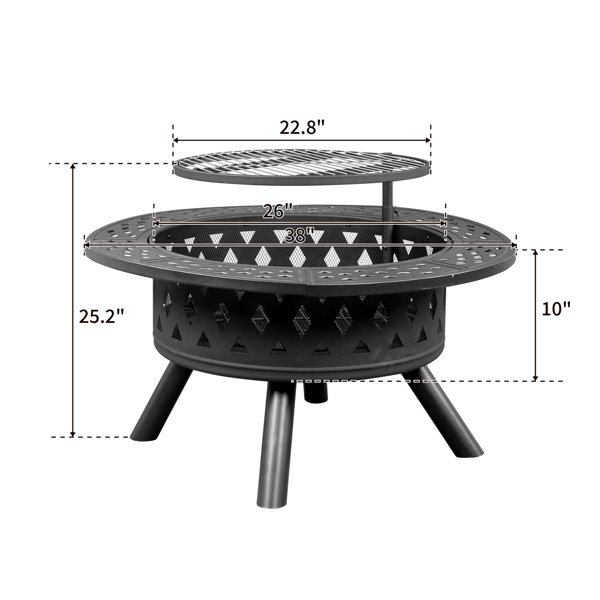 Multi-Functional outdoor fire pit,This 38'outdoor fire pit has a large cooking grill area, perfect to fit many people around for a bonfire in the patio, yard or garden. The barbecue grill the height can easily be adjusted for perfectly toasted or grilled treats over the fire.