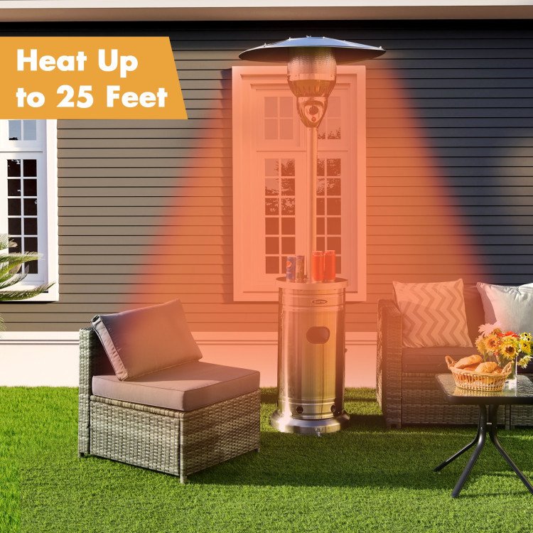 48000 BTU heat output for warming up 25 feetHeat-focusing reflective cover and flame emitter for maximum heat efficiencyTip-over protection; flameout protection and CSA certification for securityConvenient to operate with simple ignition systemHeat control knob for low or high heat settingsPuts your beverages on the drink shelf table for great convenienceFills water or sand to the base reservoir for stabilityGrounds fixers for additional stability for staying outdoorsPremium stainless steel for long time use2 smooth wheels for effortless movementFixing ropes to keep the standard 20 lbs propane cylinder (not included) in placeEasy to install with the detailed instruction and necessary accessories