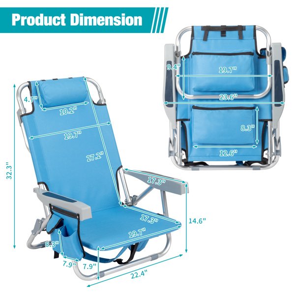 Get comfortable with this Folding beach Chair. It is an ideal solution for sitting and relaxing in comfort during outdoor activities. It is also a must-have for a sporting event; a picnic; a camping trip or even just to the backyard. The aluminum frame is not only light-weight; but also offers even greater sturdiness and stability to make it stand up to various conditions. In addition; the adjustable back with 5 positions to create better sitting feeling; and the extra storage space such as pouches on the back and side cup holder allow you to keeps the necessities right by your side. The beach chair is light-weight and easy to move so that it fits easily inside most vehicles for fast transport wherever you need.