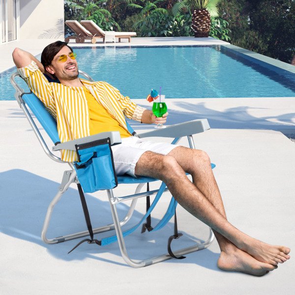 Get comfortable with this Folding beach Chair. It is an ideal solution for sitting and relaxing in comfort during outdoor activities. It is also a must-have for a sporting event, a picnic, a camping trip or even just to the backyard. The aluminum frame is not only light-weight, but also offers even greater sturdiness and stability to make it stand up to various conditions. In addition, the adjustable back with 5 positions to create better sitting feeling, and the extra storage space such as pouches on the back and side cup holder allow you to keeps the necessities right by your side. The beach chair is light-weight and easy to move so that it fits easily inside most vehicles for fast transport wherever you need.