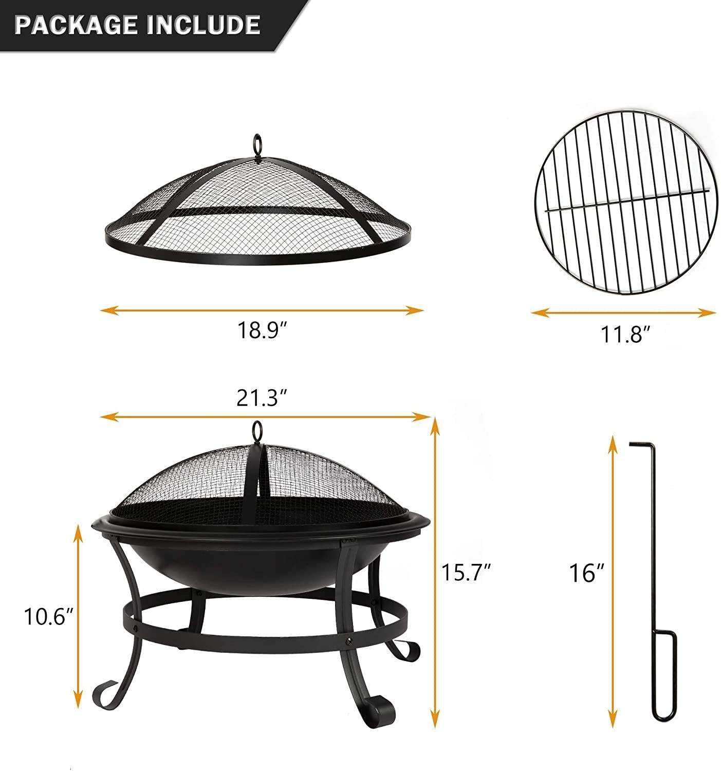 Bosonshop 22'' Outdoor Wood Burning BBQ Grill Firepit Bowl w/Spark Round Mesh Spark Screen Cover Fire Poker Patio Steel Fire Pit Bonfire for Backyard