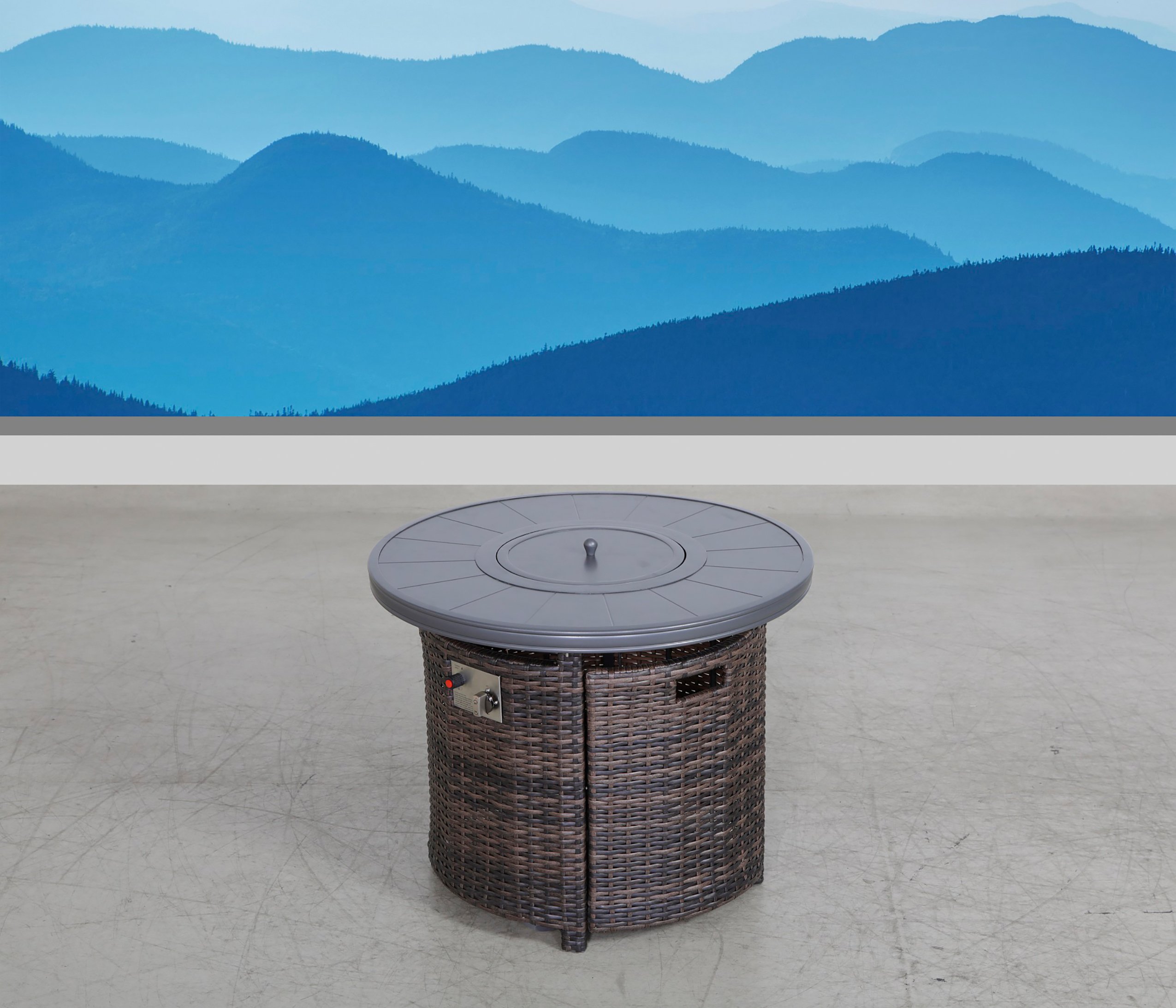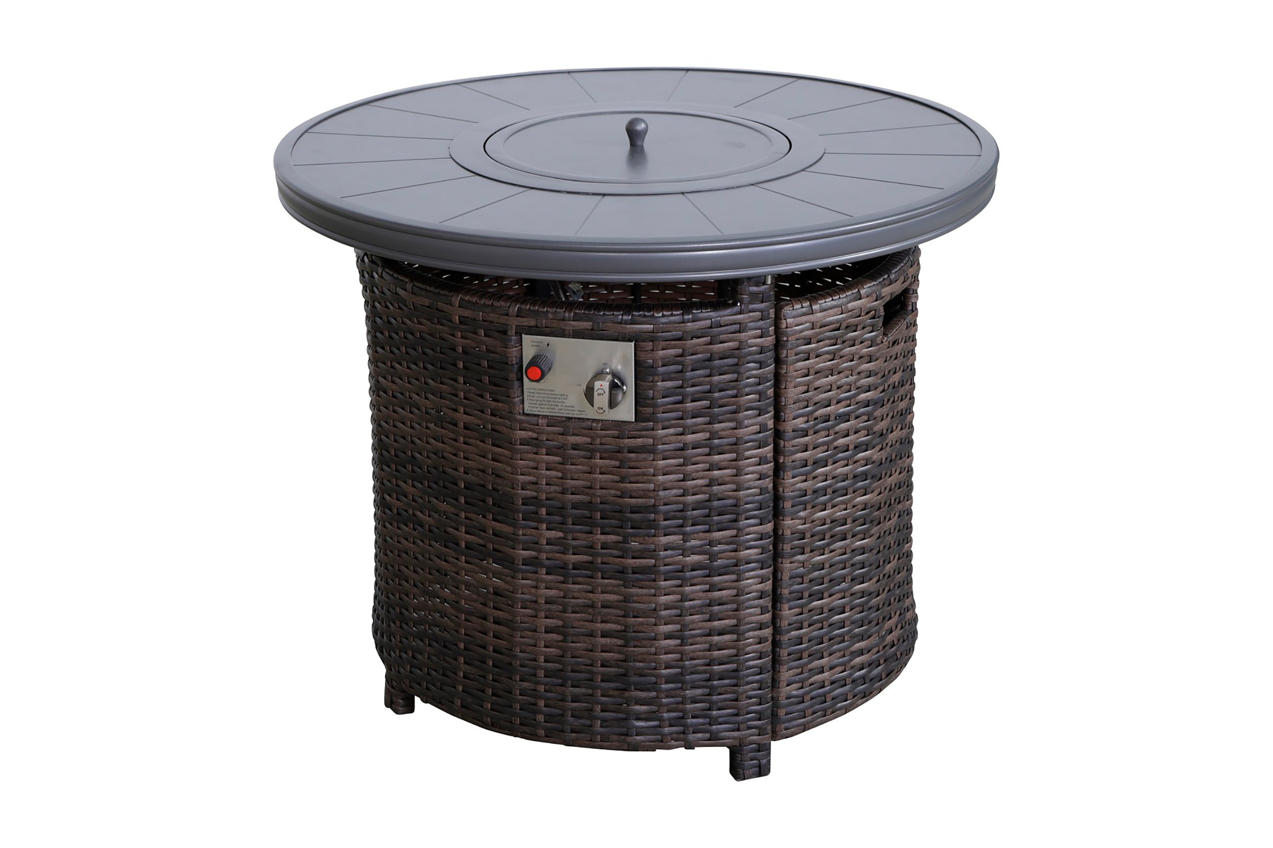 FeaturesProduct TypeFire pit tableExterior MaterialAluminum; WickerExterior Material DetailsRustproof aluminum and wickerBurning Area MaterialStainless SteelFuel TypePropane; Natural gasPieces Included1Gas Conversion FeatureYesGas Conversion Kit IncludedNoBurn Time of Fuel Accommodated8 hoursAdjustable FlameYesIgnition TypePush-buttonBTU Output55000 BTUFoldableNoPortableNoFire Pit Lid IncludedYesCover IncludedYesSpark Screen IncludedNoLog Grate IncludedNoLocationOutdoor Use OnlyHidden Fuel TankYesBatteries RequiredYesType of BatteriesAAOverall ShapeRoundSupplier Intended and Approved UseResidential Use; Non Residential UseProduct SizeMediumImportedYesBattery or Batteries IncludedYesCompatible Fuel Size20 lb.DurabilityRust Resistant; Heat ResistantProduct CareCover The Firepit When Not In UseWhat is an "integrated" vs. "external" propane tank?An integrated propane tank is a propane tank that sits hidden inside of your fire pit table. You can safely store it and use the fire pit with the propane tank tucked away.Color (Mixed Gray Finish)Mixed GrayCover MaterialPolyesterAssemblyAssembly RequiredYesWarrantyCommercial WarrantyYesCommercial Warranty Length1 YearProduct WarrantyYesWarranty Length1 YearFull or Limited WarrantyLimitedWarranty DetailsManufacturer Warranty