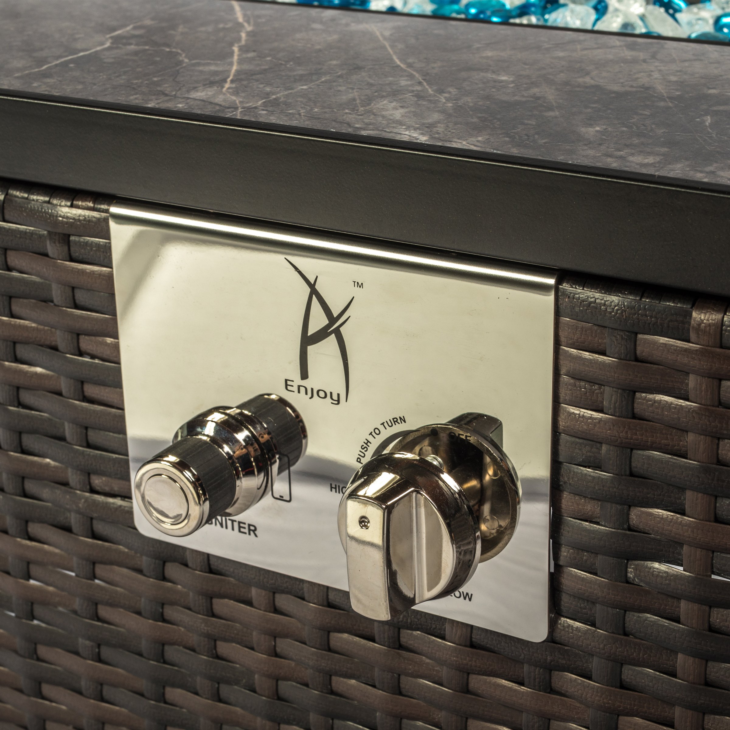 Dark Brown Wicker Body Ceramic Tile Tabletop Steel Frame ETL Approved Stainless Steel Burner, With Electronic Pulse Igniter With Separate Propane Tank Cover Fuel: Propane/ Liquefied Petroleum Gas Area Heated:11 Sq.Ft Bowl Depth: 2.2inch Housing Material: Steel + PE Rattan (or Wicker) Tabletop Material: Ceramic Tile (or Marble Tile) Flame Adjustable: Yes Steel Lid: Included Heat output: 40000BTU Rain Cover: Included Rocks: Included (with mixed color glass rocks) Gas Regulator with Hose: Included Glass Windshield (Guard): No Included LNG(Natural gas): No Support 2 Cartons Each Set
