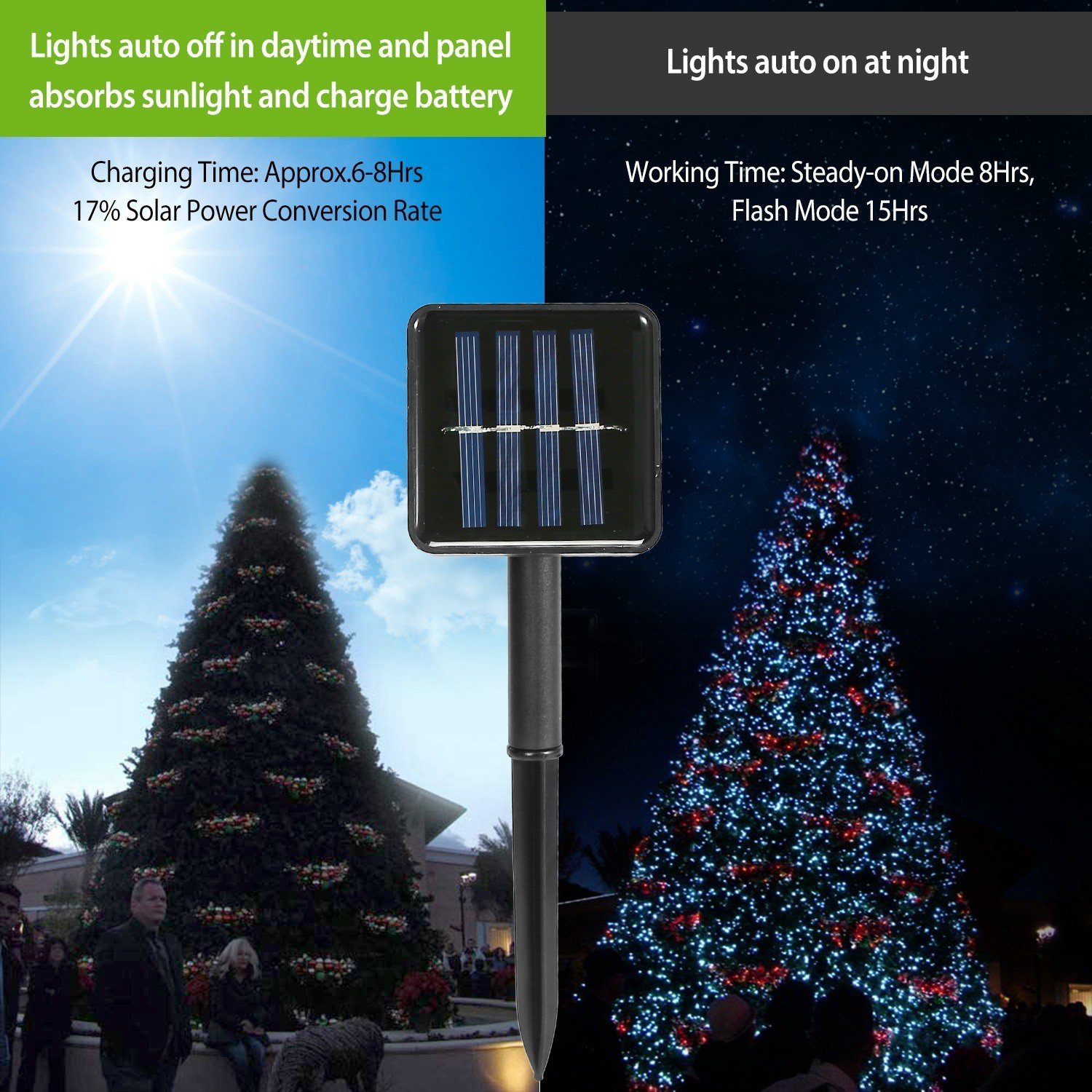 *Cost-saving Solar Powered*:Power supplied by solar energy; no extra electricity cost. Adopting high-grade polysilicon solar panel with 90°angle adjustable design and built-in 600mAh Ni-MH battery; after approx. 6-8hrs charging; our string light can work about 8hrs in steady-on mode and about 15hrs in flash mode.