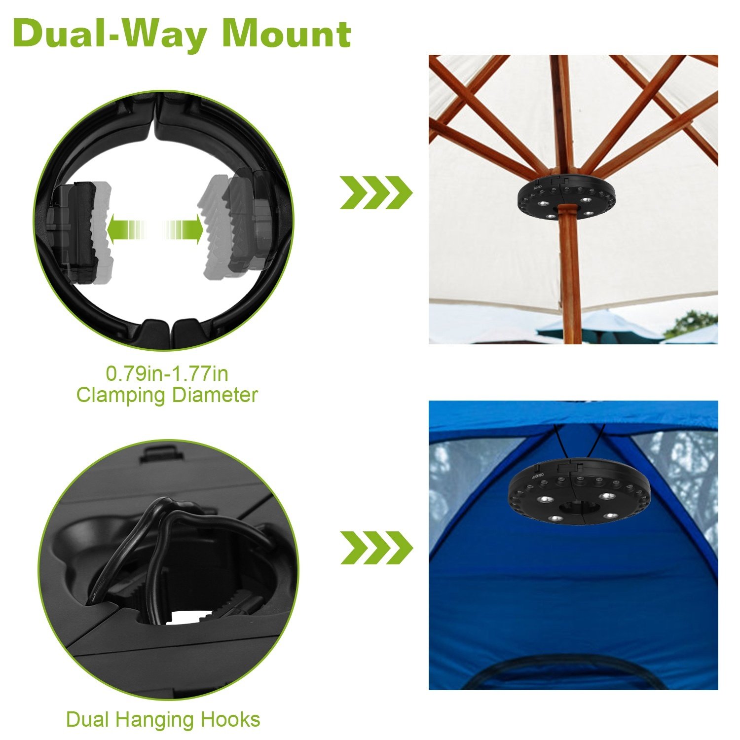 **Dual –Way Mount*:Pole mounted fit tightly for most umbrellas with a .79in to 1.77in diameter pole,together with can be easily hung on anywhere with two hooks.