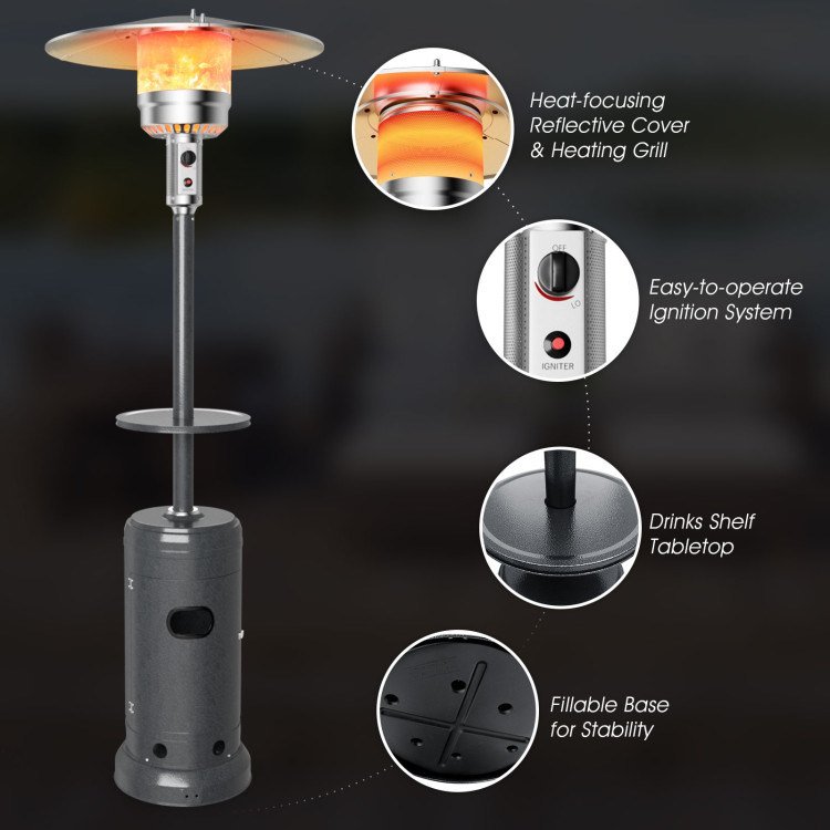 High performance heating element with power of 48,000 BTUHigh quality metal for durability and has long service timeTwo smooth wheels for convenient transportCompact design saves your space and for easy storageSand or water can be added to the bottom to increase weight and stabilityAnti - tilt design can ensure the safety during useA door on the housing for easily installs the gas tankThe reflector cover can keep the warm temperature betterA spacious warm area with a diameter of 13'Suitable for different places like patio, deck and gardenHeating effect is good with the high calorific valueExtra shelf on post for placing your drinks and winesWith the adjustable strap in for fixing the gas tankSuitable for family parties and friends gatheringsSimple operation and fast heating speedSimple assembly needed