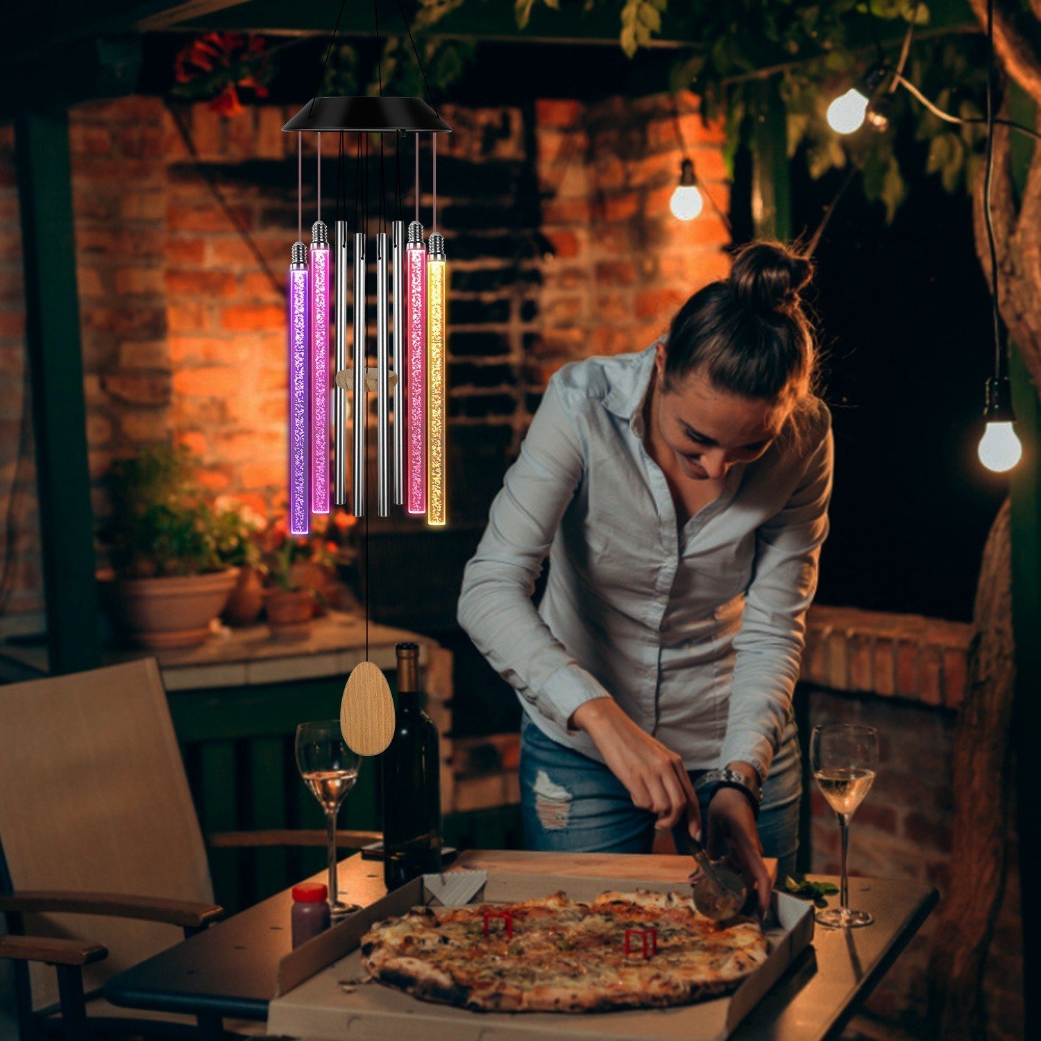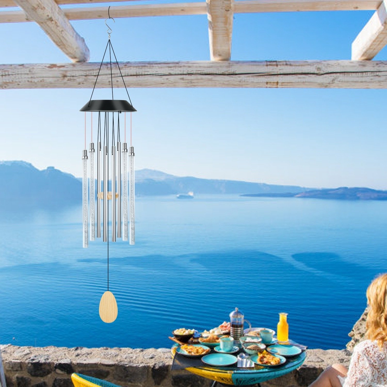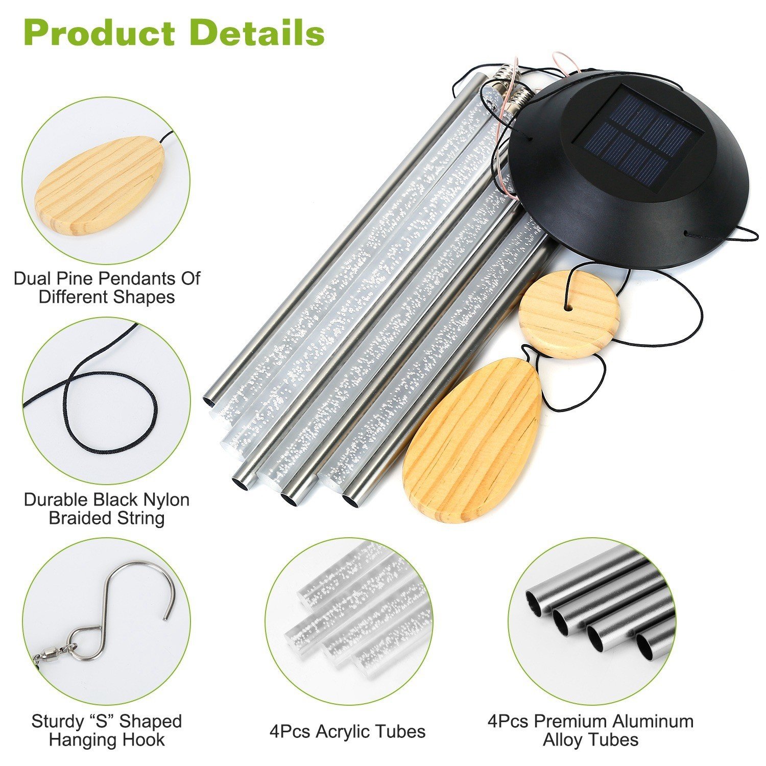 *Crisp & Pleasure Wind Chime Sound*:Our Solar Wind Chimes consist of 8 high-quality tubes(4 Aluminum Tubes & 4 Acrylic Tubes) and pine pendants. It will emit crisp and pleasure sounds when the breeze blows. It can help us relieve stress; relax us and reconnect us with nature.