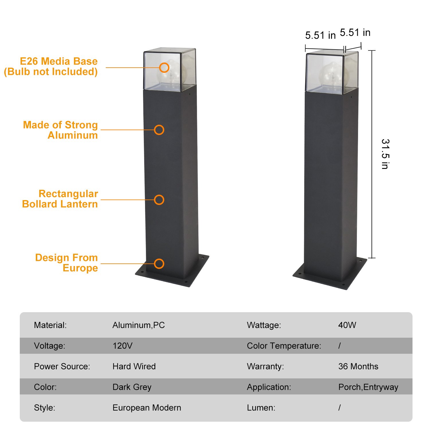 Our elegant and classic outdoor lighting design comes from well-known European designers. Many of our exterior lighting equipment have won the German Red Dot Design Award many times. This LED bollard lamp is made of 100% heavy duty die cast aluminum; which has shock power; long service life; rated life of more than 50000 hours; and is more durable.
