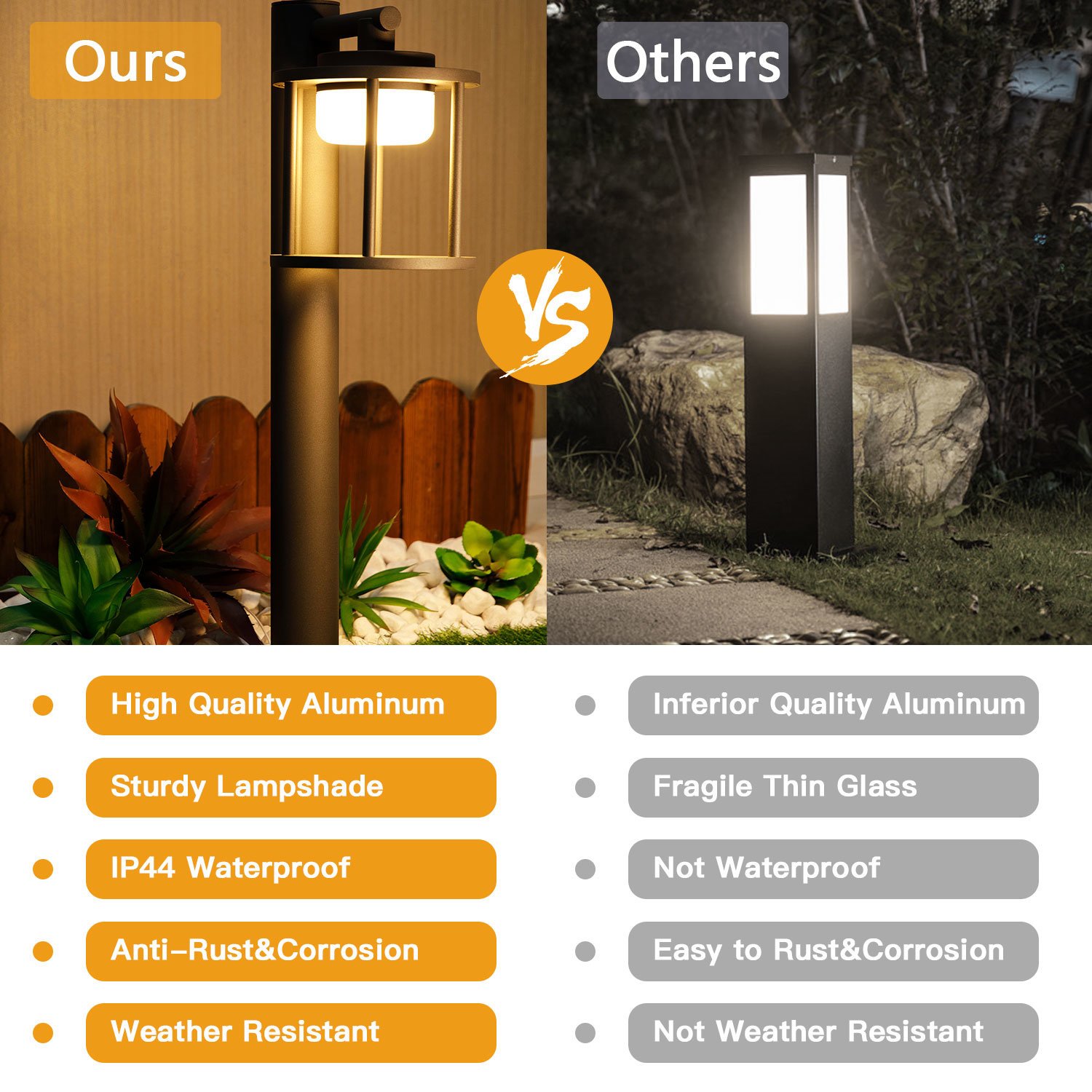 Our elegant and classic outdoor lighting design comes from well-known European designers. Many of our exterior lighting equipment have won the German Red Dot Design Award many times. This LED bollard lamp is made of 100% heavy duty die cast aluminum; which has shock power; long service life; rated life of more than 50000 hours; and is more durable.