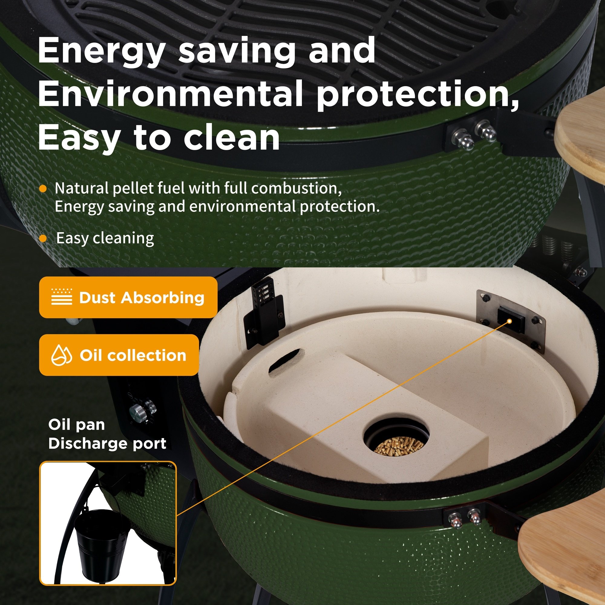 Different from traditional charcoal grill or gas oven, this ceramic pellet grill heats up quickly and distributes heat evenly. 4-in-1 energy-saving and environmentally friendly pellet grill is available in four working ranges: 50-120℉ for smoking, 120-190℉ for roasting, 190-275℉ for grilling, and 275-425℉ for pan-roasting. According to authoritative estimates, fewer nutrients are wasted, making it one of the healthiest, safest, most natural, and most popular sources of delicious food.