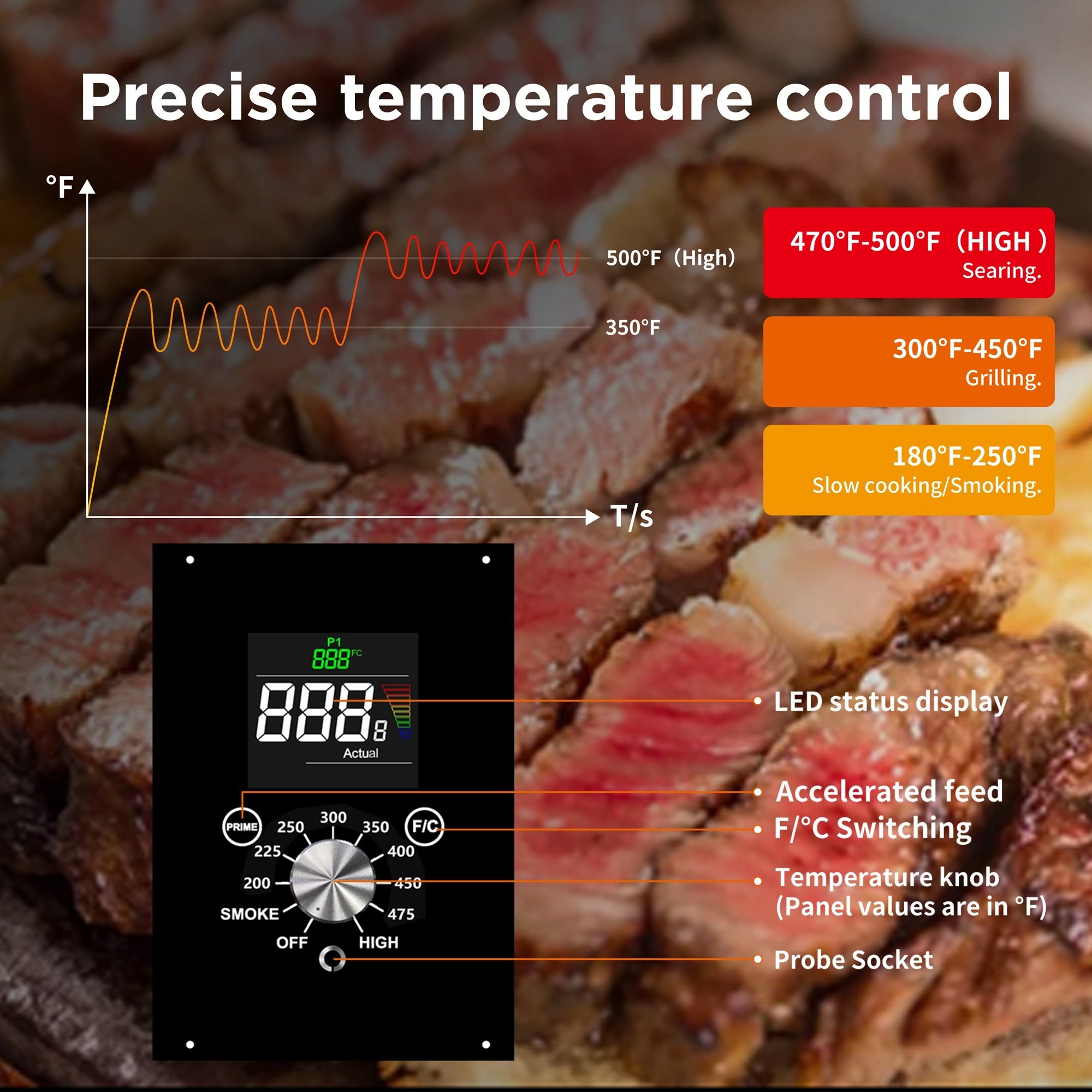 A knob starts the whole process, automatically igniting and feeding, which can be accelerated by touching the 'PRIME' key and set to degrees Celsius or Fahrenheit with the '℉/℃' key. Gravy probe detects roast temperature, LCD screen displays real-time status. This simple and straightforward design facilitates a high degree of convenience in daily use.