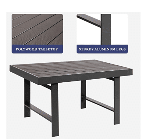 The table is the focal point that pulls it all together. A Polywood tabletop sits atop four sturdy aluminum legs, plus it has a natural slatted pattern that let rainwater trickle right through.