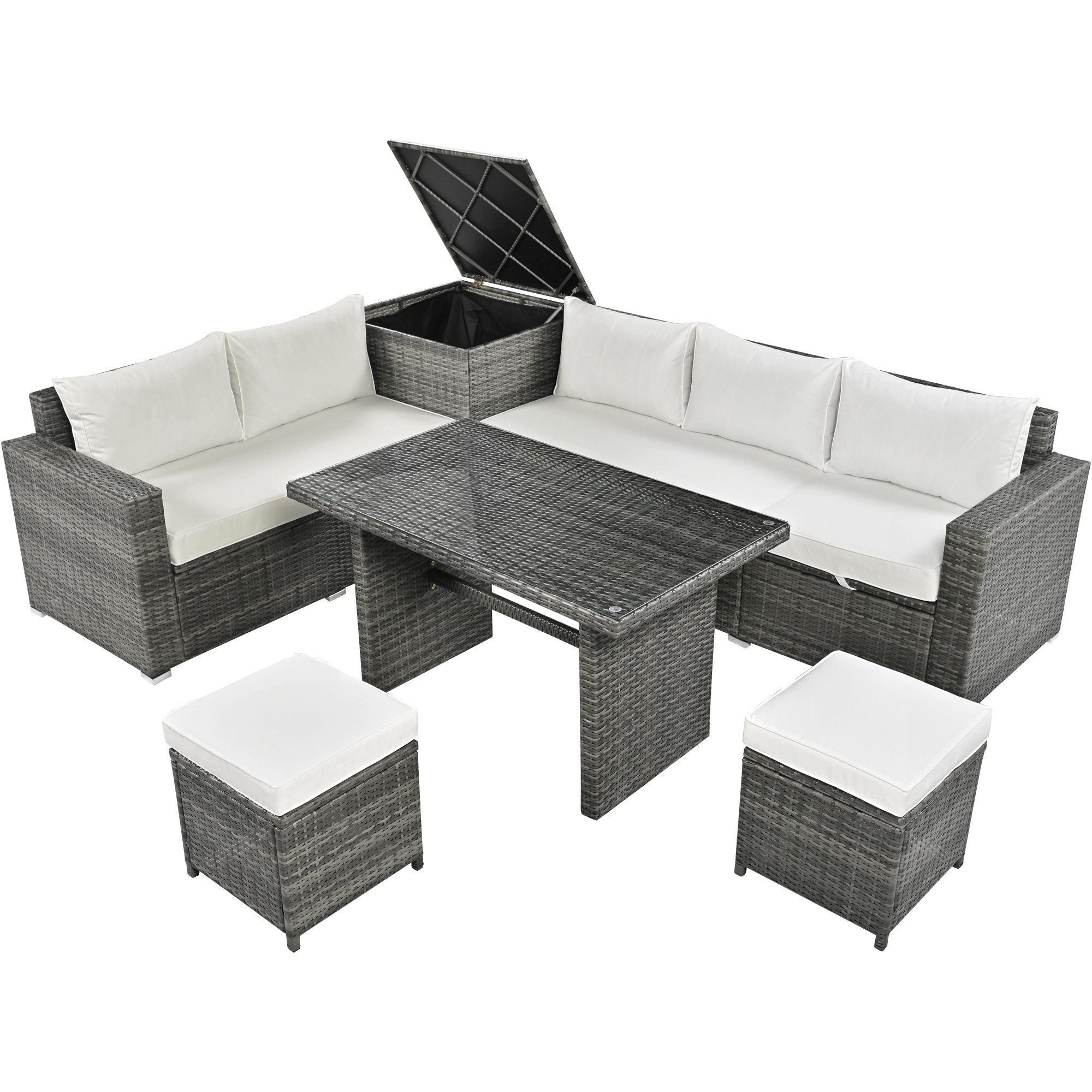 Outdoor 6-Piece All Weather PE Rattan Sofa Set; Garden Patio Wicker Sectional Furniture Set with Adjustable Seat; Storage Box; Removable Covers and Tempered Glass Top Table;