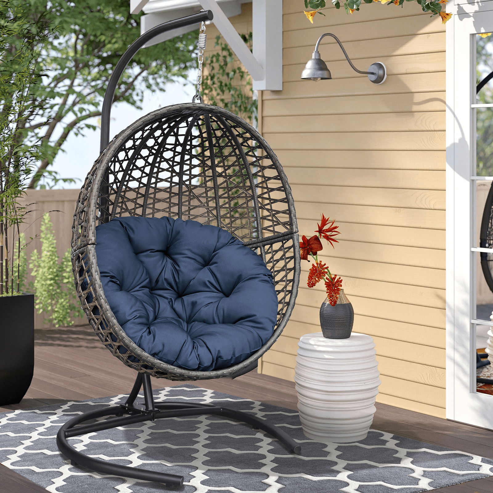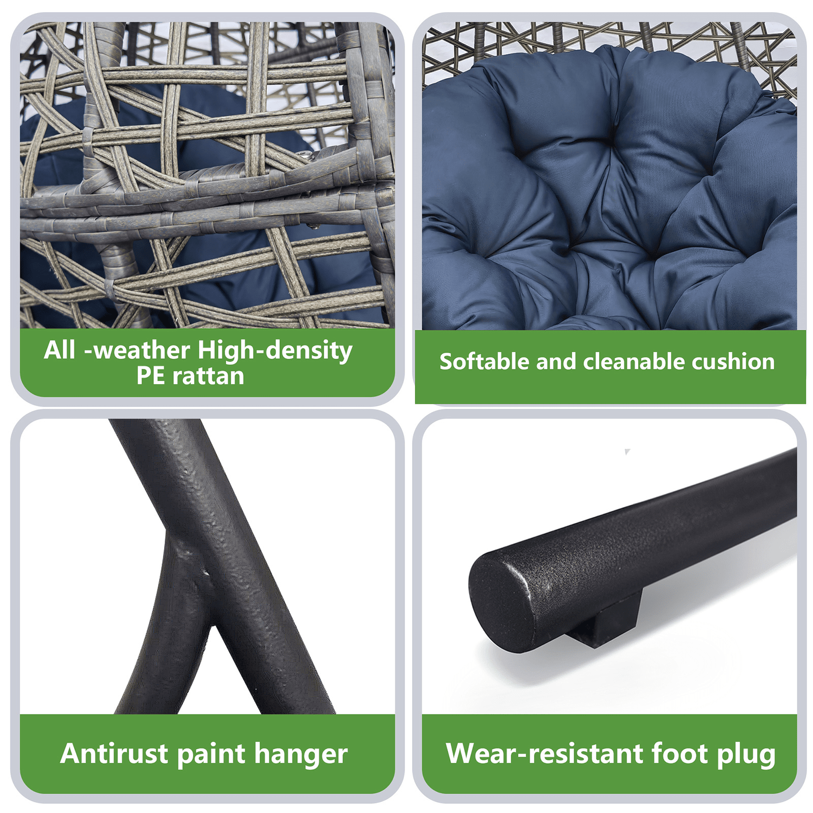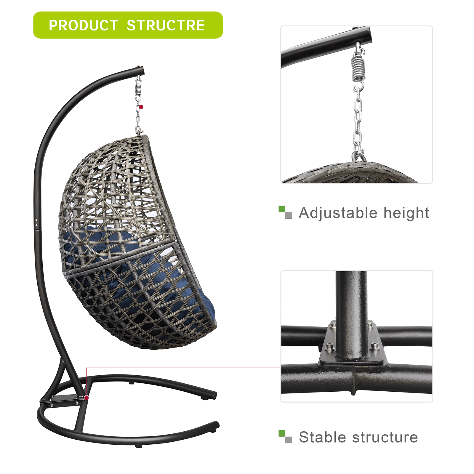 With a sturdy hanging stand base; you can place it anywhere or hang the egg hammock from the ceiling or porch. The egg nest chair comprises high-density PE rattan and all-weather waterproof fabric cushions. The stand of the hammock swing chair features a sturdy powder-coated steel frame and chain hanger; it's perfect for adding energy to your patio; backyard; porch; or poolside decor. Freestanding swing hammocks are widely used in indoor lounges; living rooms; or bedrooms.